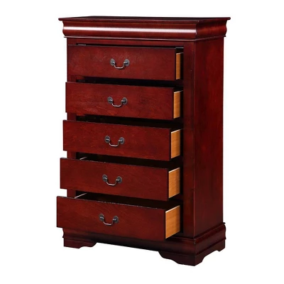 Bring casual elegance into your home with the Louis Phillipe bedroom collection. The Louis Philippe Chest in cherry finish is equipped with brushed nickel metal hardware that lends antique elegance. Store bedding, clothing, and more in the five roomy drawers. Choose from available finish options to best coordinate with existing bedroom furniture. This five drawers chest offers any bedroom a sophisticated look. Finished in classic finish with metal hardware, the simple moldings and luxurious pull handles add subtle style and appealing detail to each piece.
