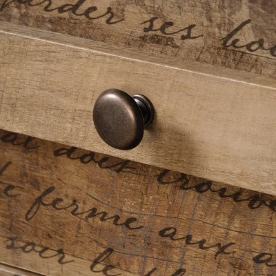 Style and storage all in one! Find a place for all your clothes while adding a one-of-a-kind look to your bedroom with this 4-drawer chest from the Dakota Pass collection. This beautiful dresser features four large drawers that open and close on smooth metal runners. These spacious drawers provide you with easy access storage of items like stacks of slacks and your favorite blouses to comfy sweatpants and your collection of t-shirts. It has a place for all your things! Each drawer front is detailed with a graphic script pattern that adds a beautiful visual that is sure to stand out in your home. Its spacious top surface also provides you with room to store additional bedroom items or display home décor like an accent lamp, bottles of cologne, your makeup bag and pictures of your family and friends too. Finished in Craftsman Oak and detailed with attractive hardware, this stunning chest of drawers is just what your bedroom is missing.