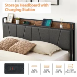This wooden bed frame beautifully combines style and functionality, featuring a rich grain texture that enhances your bedroom decor and complements any room aesthetic.This headboard features a built-in charging station, which includes 2 AC outlets, a USB port, and a Type-C port, allowing you to charge your tablet, phone, or other mobile devices without worrying about a low battery. Compared with other storage headboard spaces, our 8.7″W storage compartments are more spacious, it’s convenient for you to store many frequently used items, such as mobile phones, glasses, books, etc.