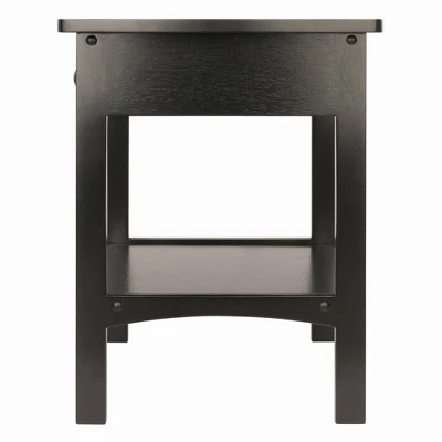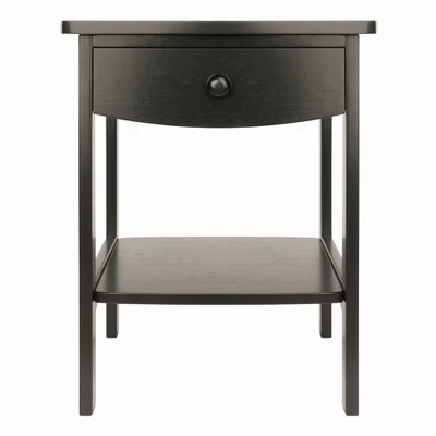 Add unique style to your bedroom space with this simple yet stunning Claire Nightstand from Winsome. This black nightstand comes with gently rounded edges on the tabletop and drawer, and blends with any style or decor with ease. The spacious top drawer houses all your bedRoom Essentialsâ„¢, while the rounded knob allows for easy opening. The bottom open shelf allows you to house your favorite books for a quick browse prior to bedtime. Assembled size is 18″W x 18″D x 22″H. Table comes with one drawer with inside dimension of 12″W x 13.75″D x 2.3″H and a shelf with surface size of 13.3″W x 14.8″D.