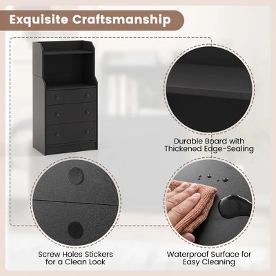 The 3-drawer dresser combines storage, display and decoration all into one. 2-tier open shelf and 3 drawers provide ample storage and classification space for a variety of daily supplies, such as books, clothes, and toys. Considering safety use, the storage organizer is equipped with anti-toppling devices for added stability. Thick and sturdy engineered wood also promises longer service life. Besides making good use of furnishes to keep home as neat as possible, it is important to create a charming decoration as well. This modern chest of drawers is a perfect collocation for living room, bedroom, closet and entryway.