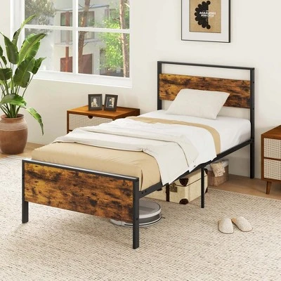 Heavy-duty metal construction offers exceptional strength and durabilityMetal slats provide strong mattress support, eliminating the need for a box springNon-slip foot pads protect floors and enhance stabilityUnder-bed clearance keeps boxes, suitcase, or other items organized and out of sightFeatures convenient buckle design to shorten assembly time Rustic wooden headboard combined with a stable metal frame enhances industrial decorBlends seamlessly with various interior styles, from modern to rusticAccommodates mattresses ranging from 8″ to 12″ in thicknessFoam pads on slats minimize noise for a peaceful sleep experience(Full/Queen/King)