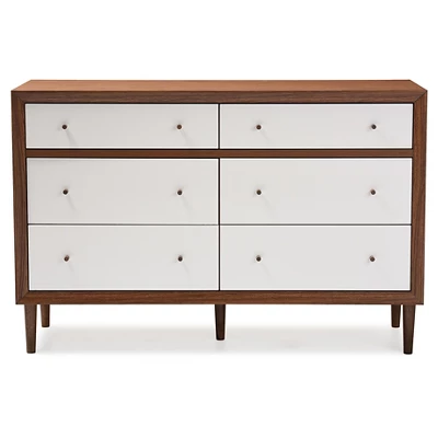 Highlight the handsomely modern feel of your space with the superior storage and Scandinavian style of the Harlow dresser. Made from sustainably sourced engineered wood and sturdy rubber wood legs with lasting quality, the dresser is finished in white and walnut two tone PU veneer, offering a contemporary aesthetic into your living space. The six drawers open to reveal internal storage space that’s ideal for storage. Splayed legs complement the white-and-walnut contrast tones for a design steeped in retro, Scandinavian style. Streamlined style-lines for a contemporary design that works well with a range of interiors, from mid-century to modern and from Scandinavian to Hamptons or urban loft, the Harlow will provide ample storage and style to your bedroom for practicality. Made in Malaysia, the Harlow requires assembly. Dimensions: 35.69″ High x 53.98″ Wide x 16.3″ Long; Drawers (Upper Left/Right): 3.34″ High x 22.75″ Wide x 13.18″ Long; Drawers (Middle&Lower Left/Right): 5.7″ High x 22.75″ Wide x 13.18″ Long