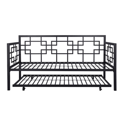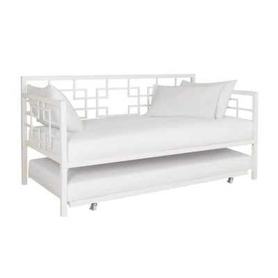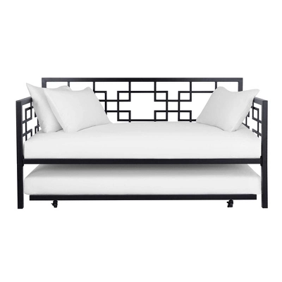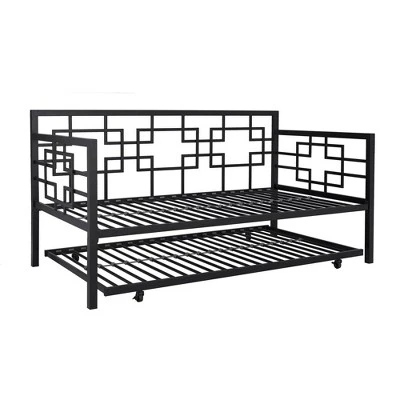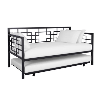 Save on space while adding style to your home with the Room & Joy Gemma Twin Daybed with Trundle. This space-saving solution is perfect for growing family, shared bedroom and guest room. Constructed with sturdy metal, the sleek and decorative metal adds a flair of modern luxury to any interior. The trundle neatly tucks away under the daybed for the ultimate in-space functionality, making it ideal when hosting overnight guests. the trundle also comes with caster wheels that lock in place, ensuring a restful night of sleep. Both the bed and trundle are equipped with premium secured metal slats that provide even weight distribution and air circulation. Designed to fit one standard twin size mattress on daybed (maximum 8 inches) and one standard twin size mattress on trundle (maximum 6 inches) – both sold separately. The Gemma is a nice lounging area by day, and a stylish bed at night. Just top it with a blanket, and colorful pillows and you are all set! Available in multiple colors, the Room & Joy Gemma Twin Daybed with Trundle ships in one box and it is easy to assemble.