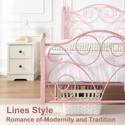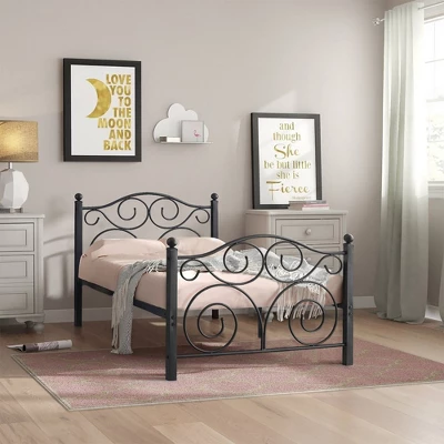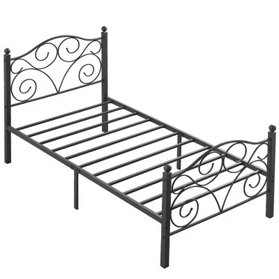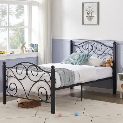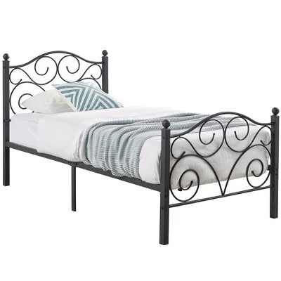 Transform your bedroom or spare room with this sophisticated scroll metal bed frame. It features a beautiful metal scroll design on the headboard and footboard, creating a romantic ambiance in your home. Made of solid and durable metal, this bed frame has multiple support legs for stability. Thanks to the metal slatted structure, you can use it with various types of mattresses without needing a bulky box spring. The bed also has 12.6 inches of clearance underneath, providing extra storage space.Specifications:Size: Twin/Full/QueenColor: BlackMaterial: MetalPackage Dimensions:41.33’’L X 20.87’’W X 4.7’’H(Twin)56.3’’L X 20.87’’W X 4.3’’H (Full)62.8’’L X 20.67 ’’W X 4.53 (Queen)Ground Clearance: 12.6 inchMax Weight Capacity: 650LB(Full&Queen); 450LB(Twin)Package Weight: 28.55LB/12.95KG(Twin); 51.48LB/23.35KG(Full); 52.9LB/24kg(Queen);Box Spring Needed: NoWhat You Will Get:1Bed Frame1Assembly Instructions1*Installation Tool